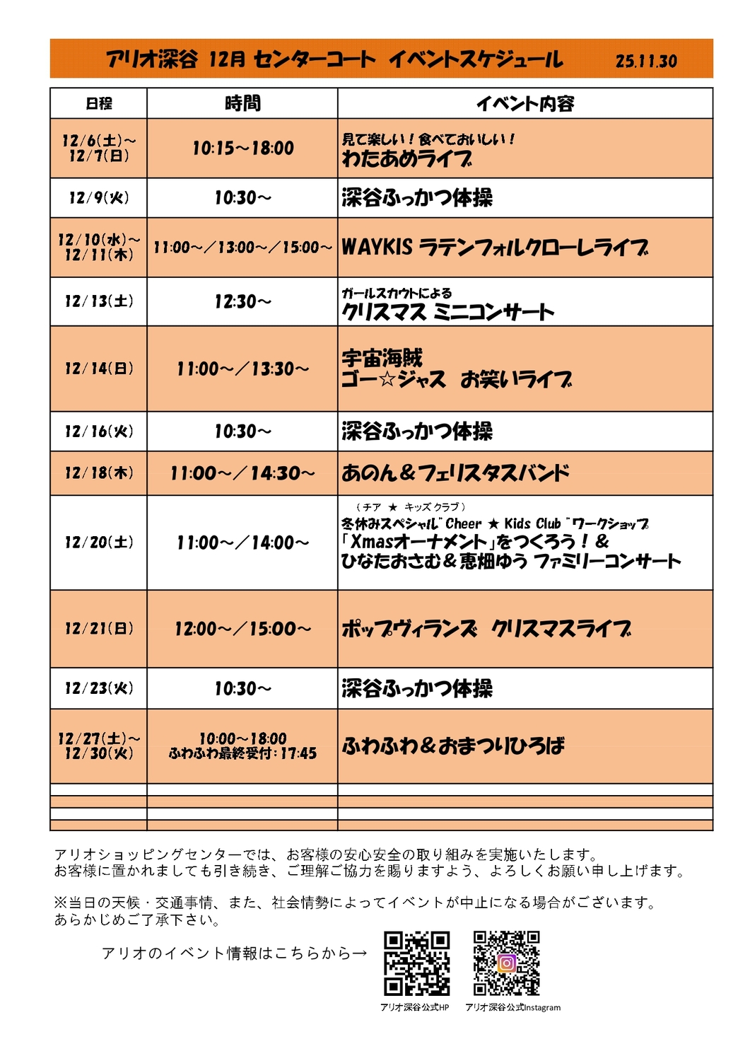 12月のセンターコートでのイベントスケジュールです。