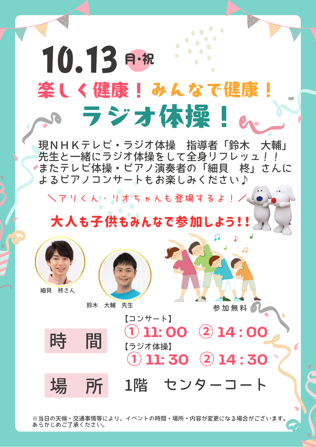 またテレビ体操・ピアノ演奏者の「細貝 柊」さんによるピアノコンサートもお楽しみください♪