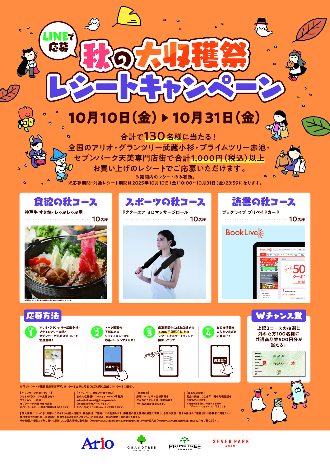 全国のアリオ・グランツリー武蔵小杉・プライムツリー赤池・セブンパーク天美専門店街で合計1,000円(税込)以上お買い上げのレシートでご応募いただけます。