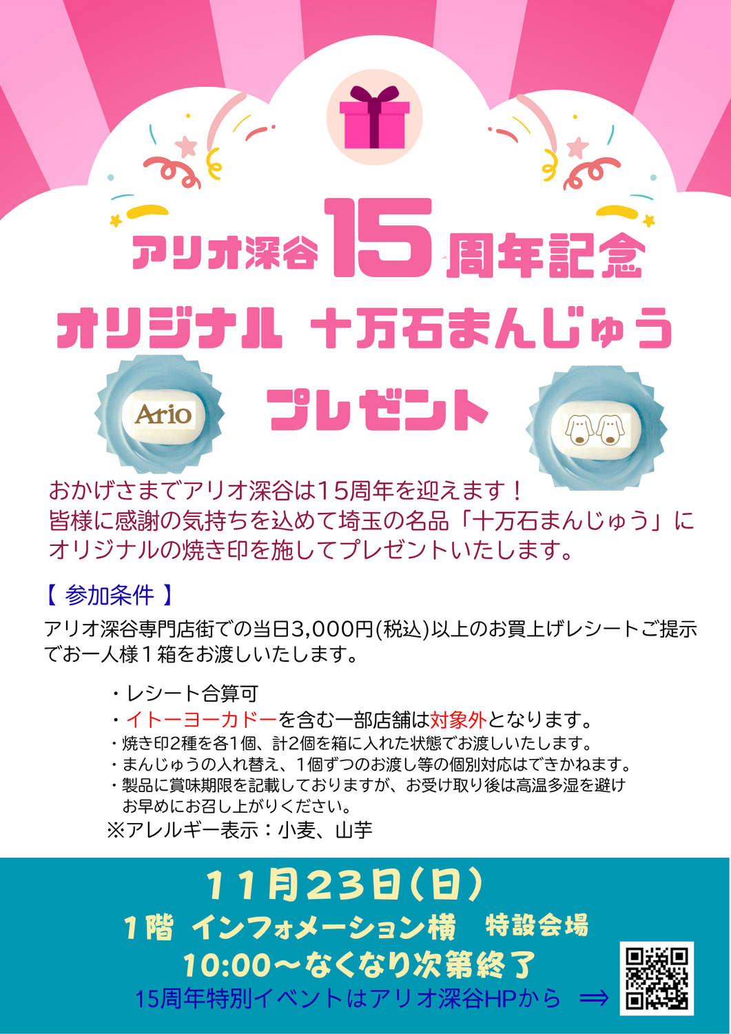 アリオ深谷専門店街での当日3,000円(税込)以上のお買上げレシートご提示でお一人様1箱をお渡しいたします。