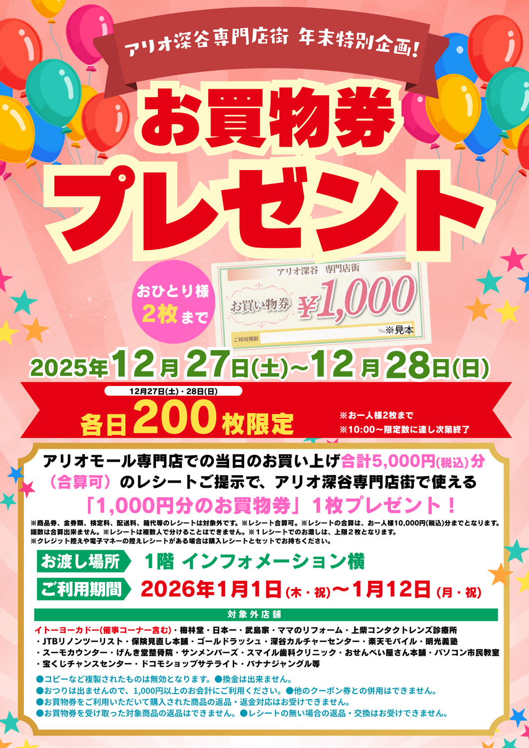 アリオモール専門店での当日のお買い上げ合計5,000円(税込)分(合算可)のレシートのご提示で、アリオ深谷専門店街で使える「1,000円分のお買い物券」1枚プレゼント!