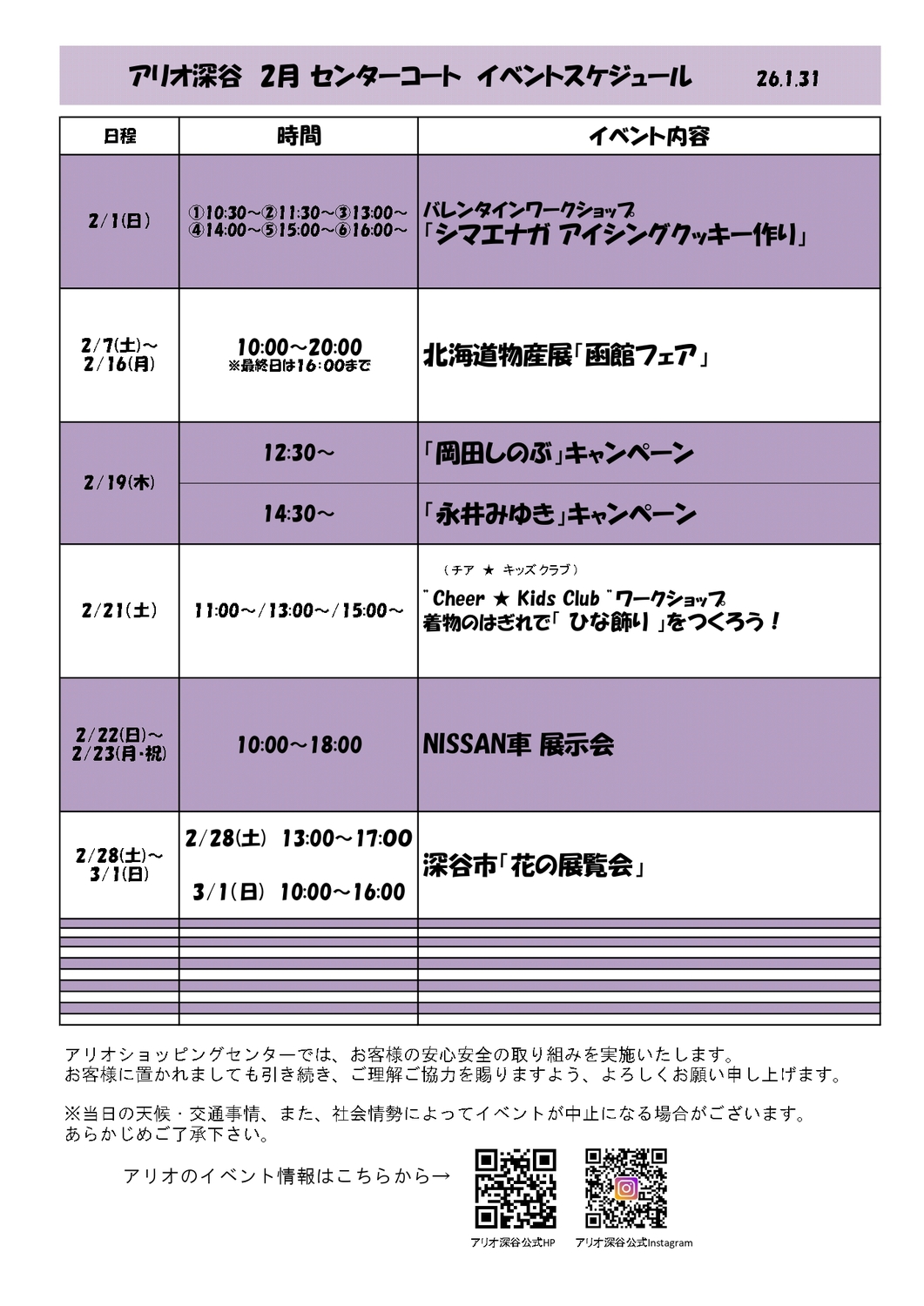 また、社会情勢等によってイベントが中止・変更になる場合がございます。予めご了承ください。