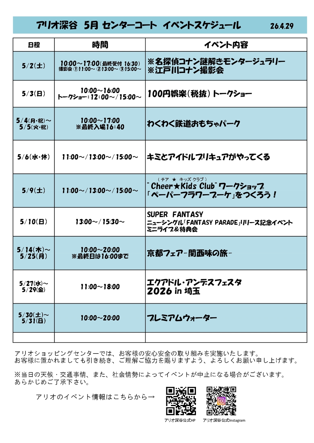 5月のセンターコートでのイベントスケジュールです。