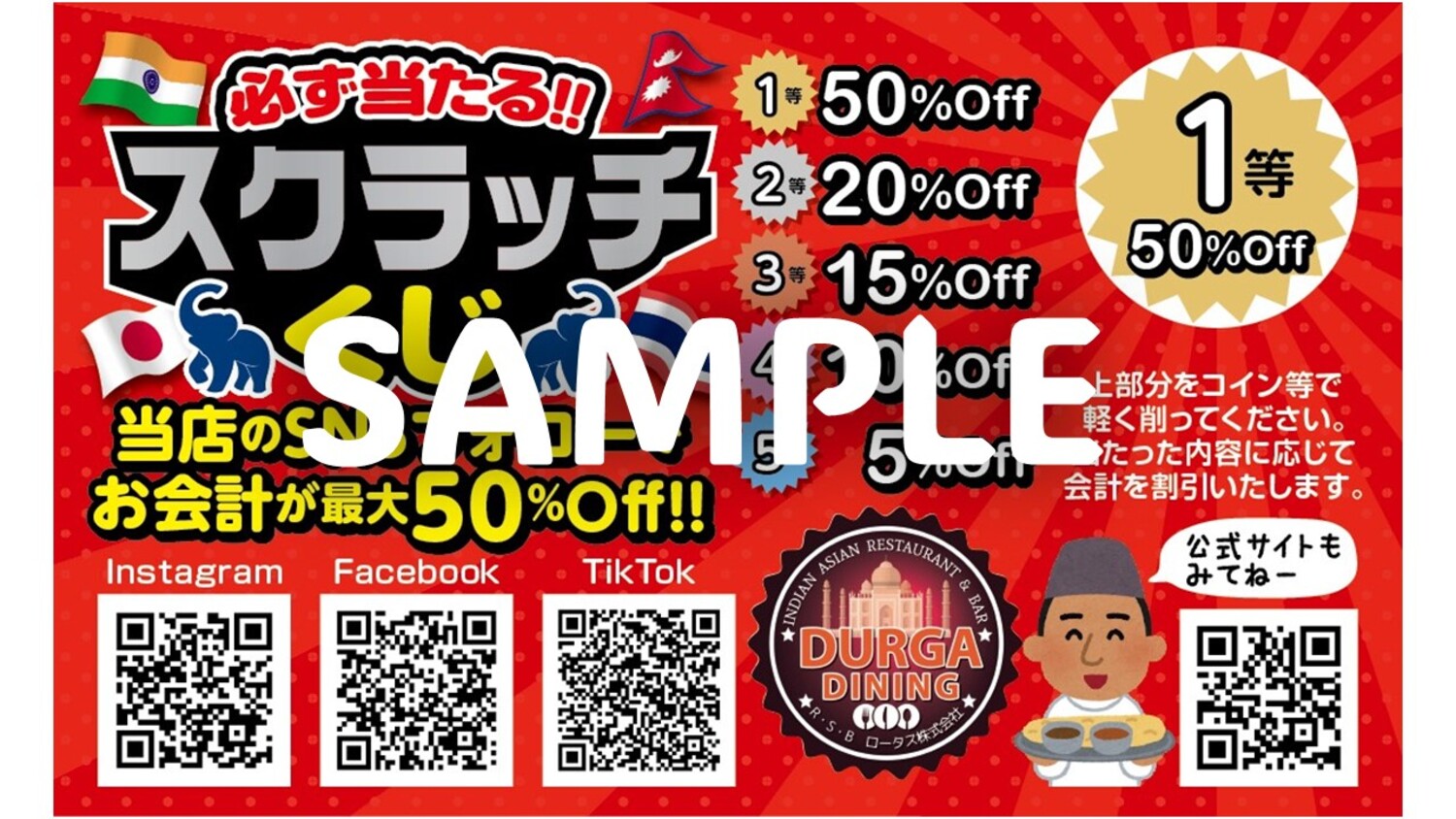 当店SNSをフォローでお会計が最大50%OFFになるスクラッチくじを1枚差し上げます!