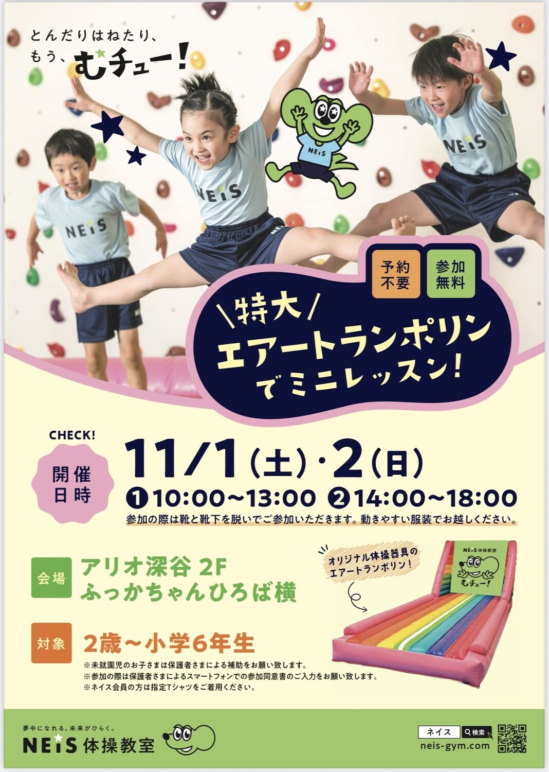 2Fふっかちゃん広場横にて、ネイスオリジナル体操器具を体験できるエアートランポリンでミニレッスンのイベントを開催いたします。