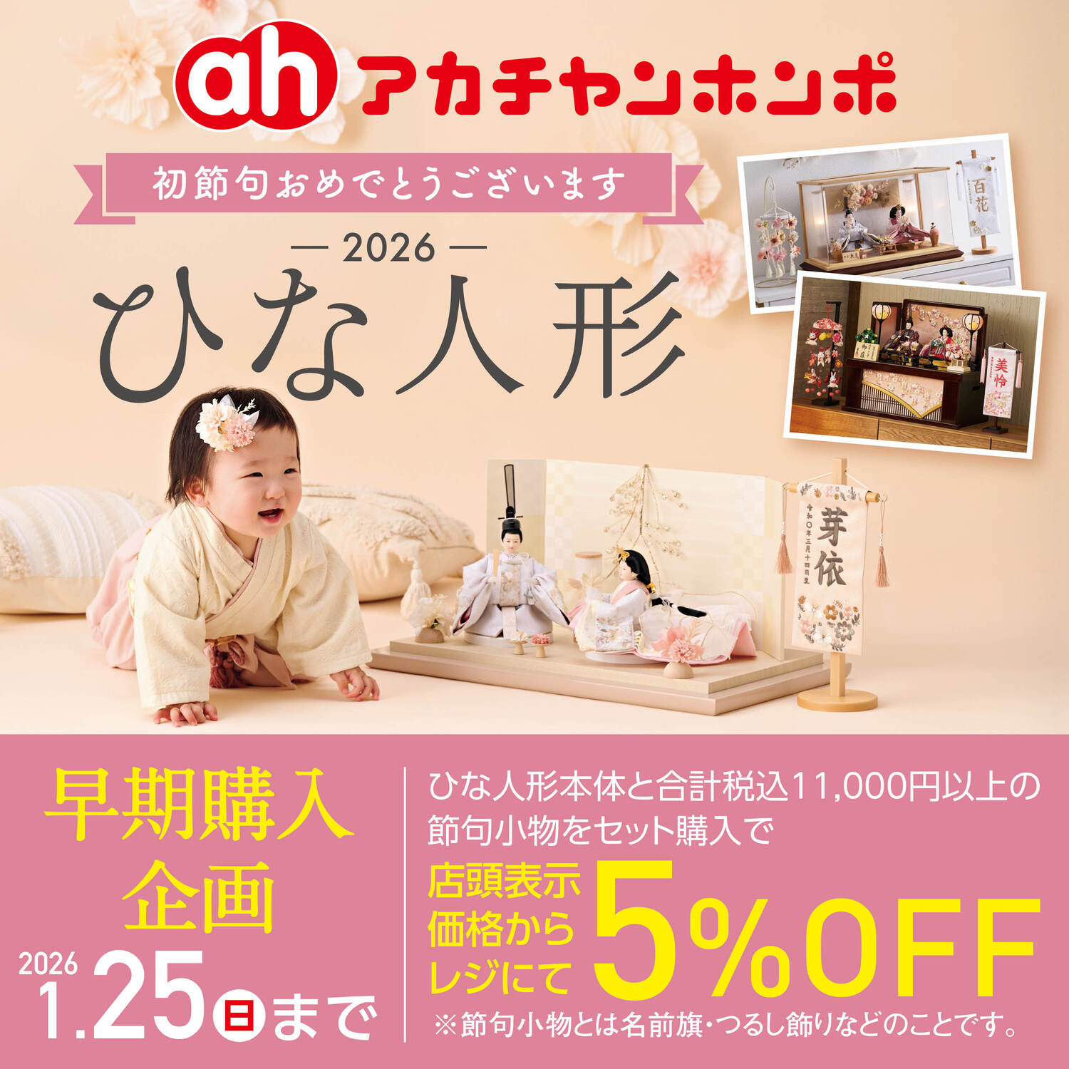 2026年1月25日(日)までに、ひな人形本体と、合計11,000円以上の節句小物をご購入いただきますと、合計金額から5%割引の早期購入企画を実施中です!ぜひお早めのご来店お待ちしております♪♪